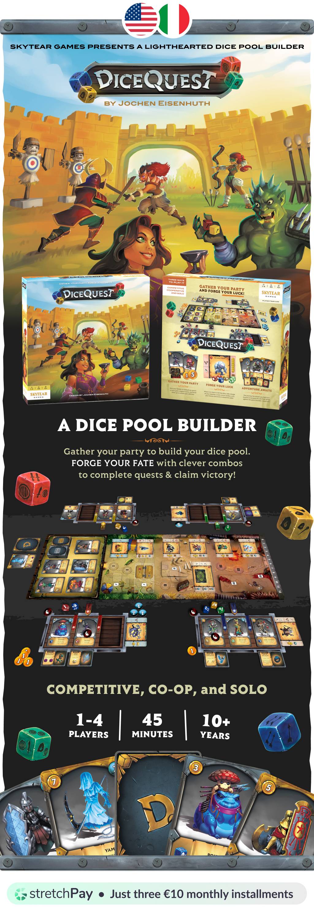Dear friend,I'll keep this simple: we're live with the crowdfunding of Dicequest!It is our "dice pool builder" for 1–4 players, 45 minutes, ages 10+, where YOU forge your fate.(I.e. luck plays a role, but it does not play in your place!) Jochen designed it to have game to play with his kids that was crunchy enough for gamers/geeks too. You can get it with just three €10 monthly installments. Or a bit more for the fancy deluxe edition. Please back Dicequest now on Gamefound and spread the word...
